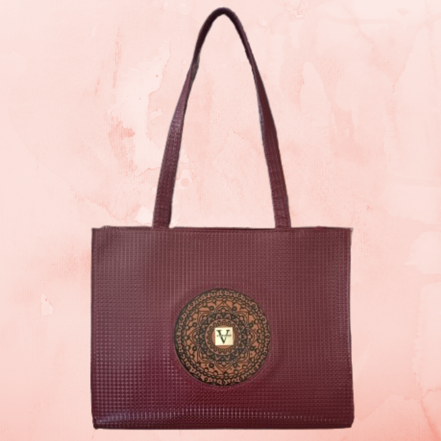 - The Embossed Printed Tote Bag boasts of an elegant and minimalist design, complete with a detailed circular pattern on the front.
